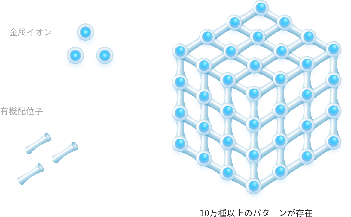 多孔性配位高分子(PCP: Porous Coordination Polymer)は、有機金属構造体(MOF: Metal-Organic Framework)とも呼ばれ、金属イオンと有機配位子から構成される、ナノレベルで制御された細孔を有する多孔性材料です。
